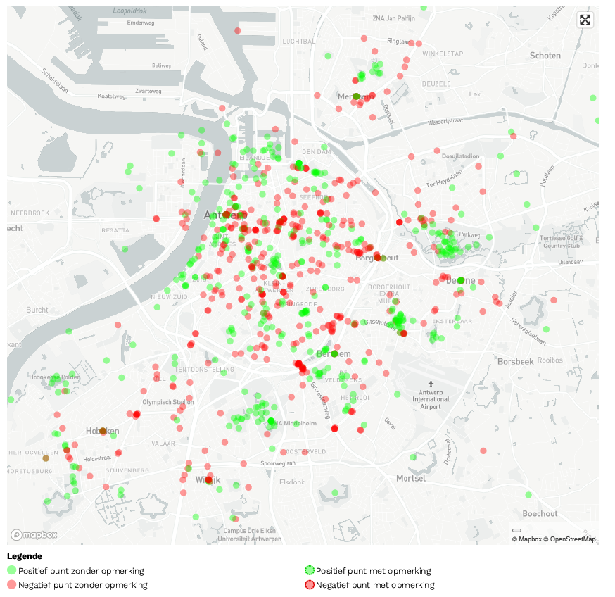 De kaart kleurt gevarieerd rood en groen, maar in een oogopslag merk je nu al dat de grote assen vaak negatieve reacties krijgen. Lange wachttijden, drukknoppen, te kort groen, ... liggen daar vaak aan de basis.