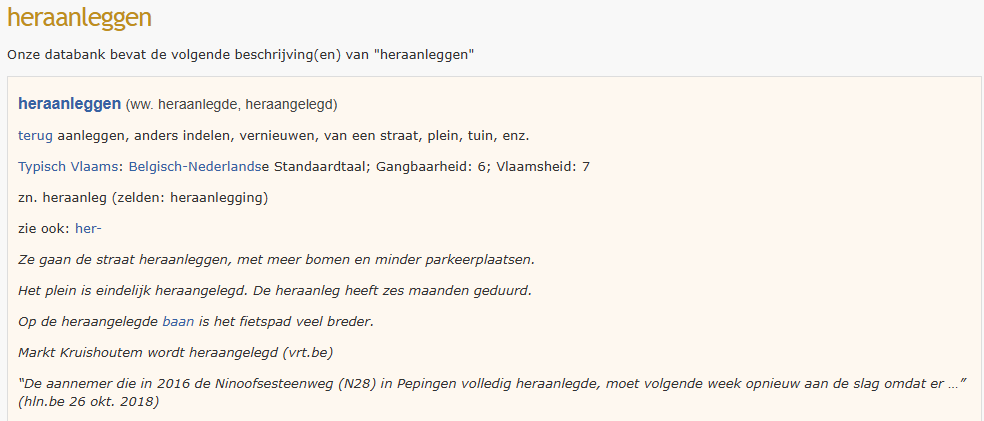 “Heraanleg” wordt in het Vlaams Woordenboek gedefinieerd als “terug aanleggen, anders indelen, vernieuwen, van een straat, plein, tuin, enz.” Men geeft daarbij een voorbeeld: “Ze gaan de straat heraanleggen, met meer bomen en minder parkeerplaatsen”.